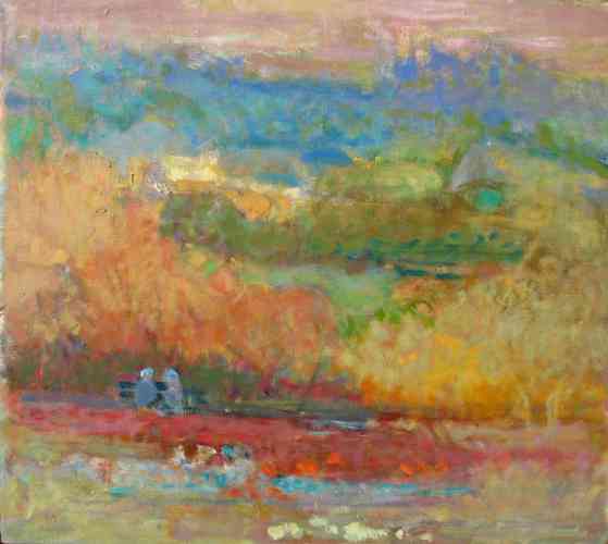 | Józef Gazda - Malarstwo > Galeria 1 | Krajobraz z laweczka 80x90cm olej plotno 1998 |